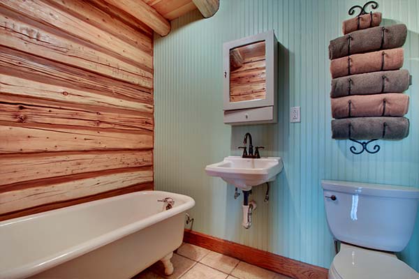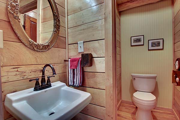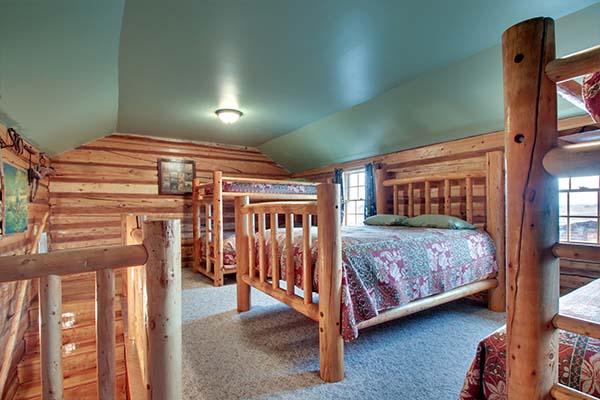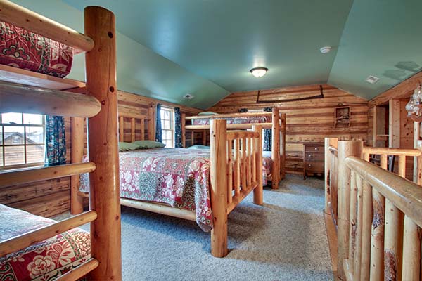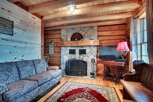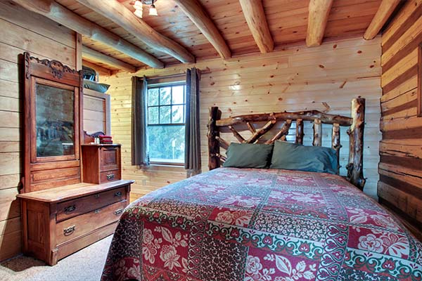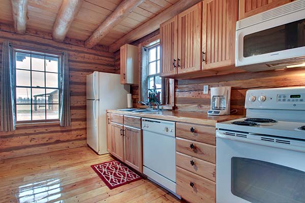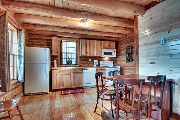 The Jamison is a charming cabin that features a queen sized antique iron bed and a log bunk bed in the sleeping area. The bunk bed consists of a double on the bottom and twin on top. The kitchen has a hard wood floor, hickory cabinets, polished wood table top and for modern convenience it is equipped with a stove, microwave, refrigerator, dishwasher, toaster, and small sink. We have also provided pots, pans, dishes, and utensils. The bathroom has a stone floor with a walk in shower.