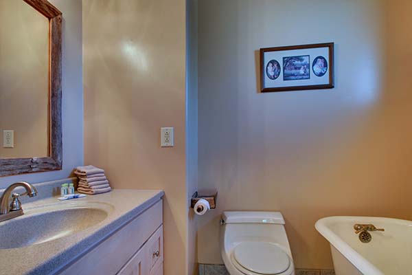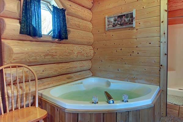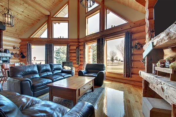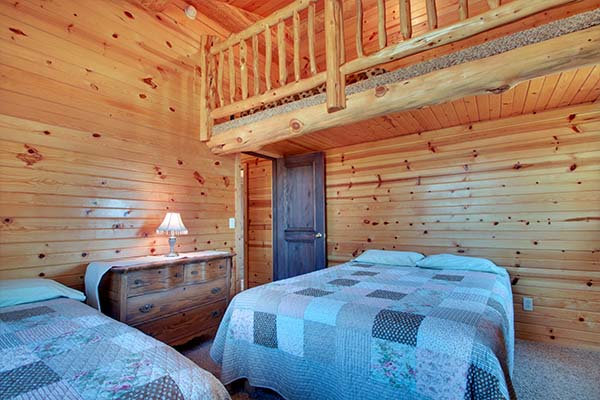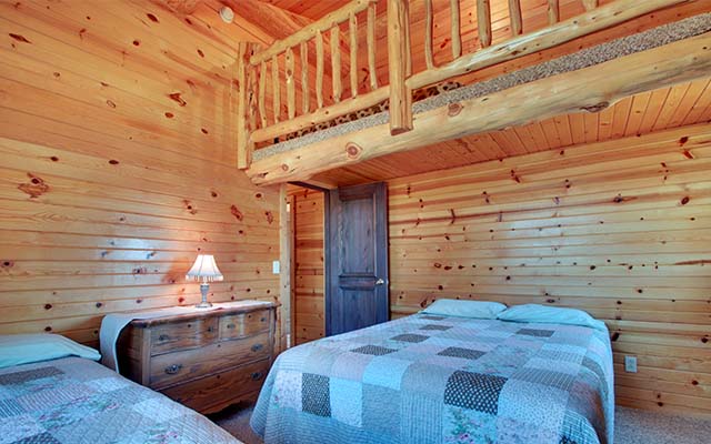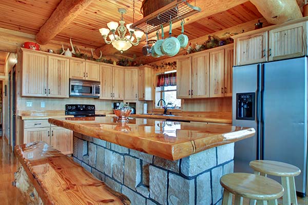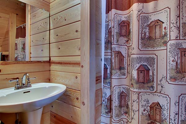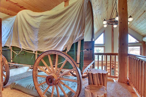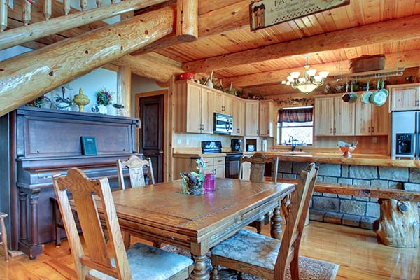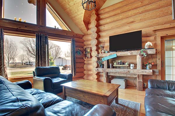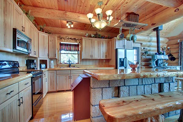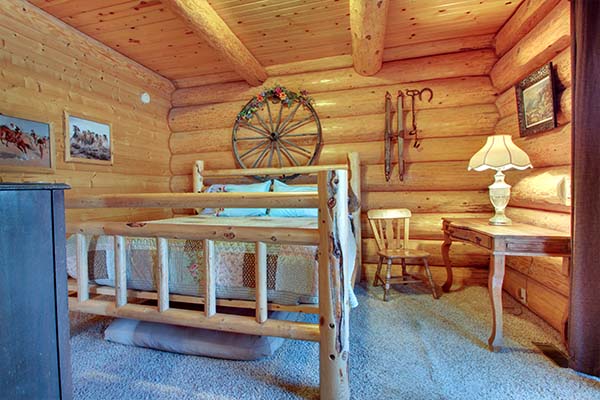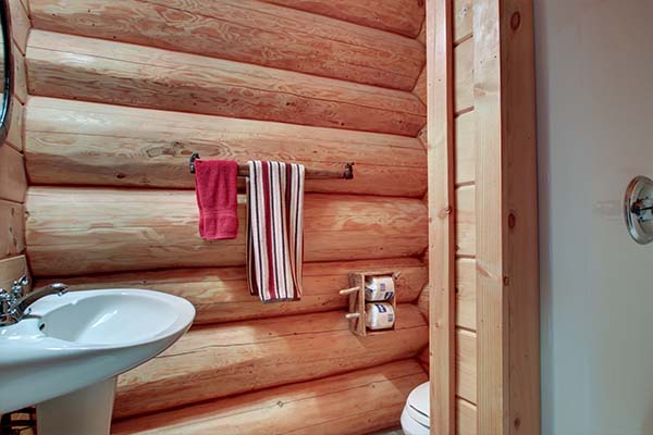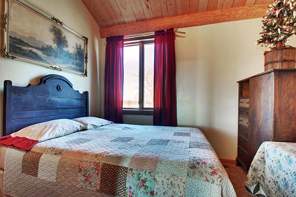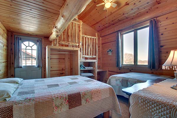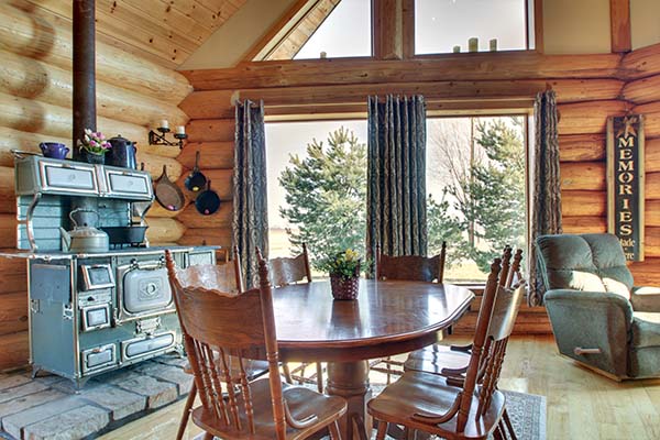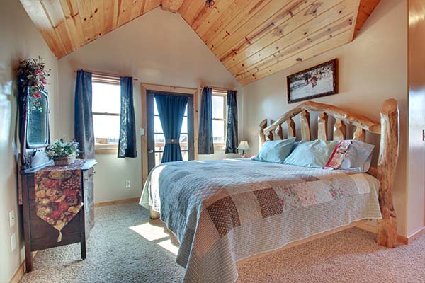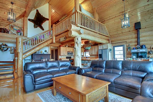 The Main Lodge has been described as, ‘Outstanding and beautiful with a lot of neat personal touches’. The huge cedar logs came from British Columbia. Upstairs has three bedrooms and a loft. One bedroom is an old log cabin with a barn-wood lean-to that also makes up one of the upstairs bathrooms. Two of the bedrooms have outside balconies with lovely views.